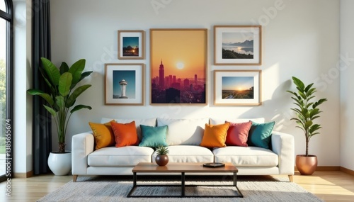 Modern living room interior with eclectic mix of photo frames, patterns, abstract shapes