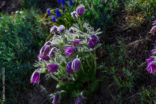 Kępa dzikich, fioletowych kwiatów o zwisających pąkach rośnie na naturalnym, trawiastym podłożu w świetle dnia. Rośliny mają charakterystyczne, omszone łodygi i liście, a w tle widoczne są dodatkowe k