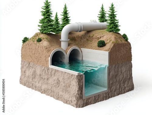 Exploded schematic of a dam s water diversion tunnel, showing intake structures and bypass channels