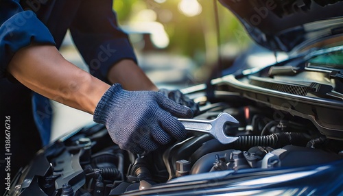 ボンネットを開けてスパナを使う自動車整備士の手元