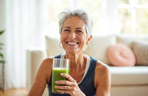 Mature woman drinks green juice, smiles happily. Senior lady enjoys smoothie, health conscious lifestyle. Active senior citizen drinks detox beverage after workout. Healthy eating, wellness, happy