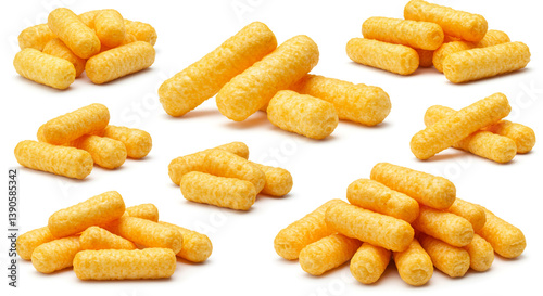 Golden Puffs of Delight: A Tempting Collection of Crunchy Snacks Arranged in Appealing Piles Against a Pure White Background