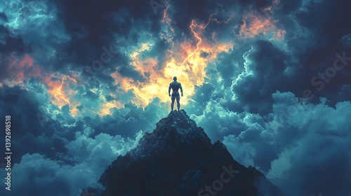 Silhouetted figure stands atop a mountain peak during a thunderstorm