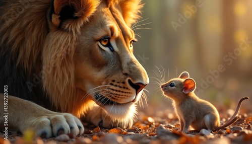 Lion mouse gaze closely. Curious animal wildlife relationship portrait. Big cat small rodent eye contact in beautiful nature. Friendship, love, peace, harmony, courage, trust between species.