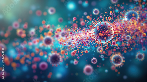 Microscopic view of colorful viruses bacteria and pathogens microbiology and infectious disease medical science healthcare research and development biology and virology pandemic and epidemic outbreak