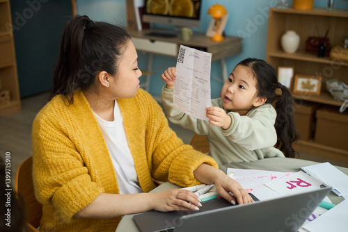 Mother assisting young daughter with schoolwork at table, surrounded by learning materials and books, they both focusing on document