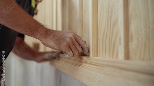 Carpenter installing wooden trim along a wall. Featuring detail and finishing