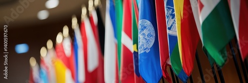 International conference on global diplomacy and politics with diverse country flags representing unity among nations