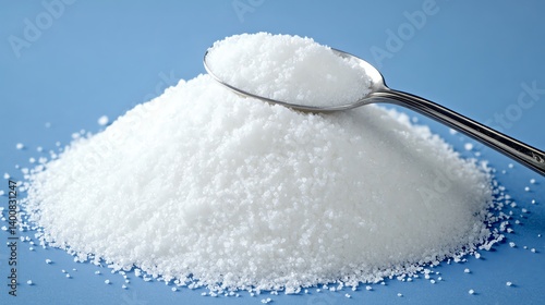 Heap of White Granulated Sugar with a Spoonful on Blue Background
