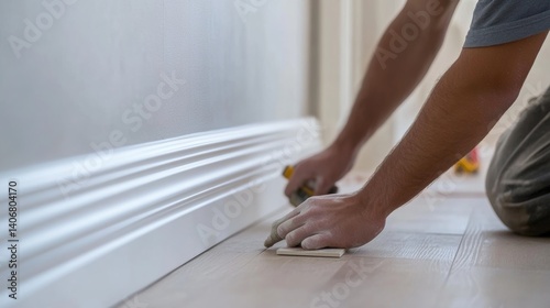 Carpenter installing trim molding along a living room wall. Featuring trim work