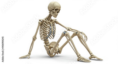 A highly detailed 3d rendering of a human skeleton in a seated pose with realistic textures and studio lighting for anatomical study and macabre fascination