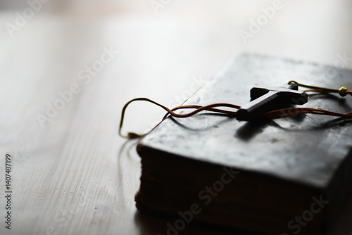 Old Bible and Wooden Cross on Light Wooden Table - Symbol of Faith, Religion, Christianity