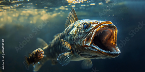 Predatory fish ambushing its prey high speed underwater action with dramatic lighting