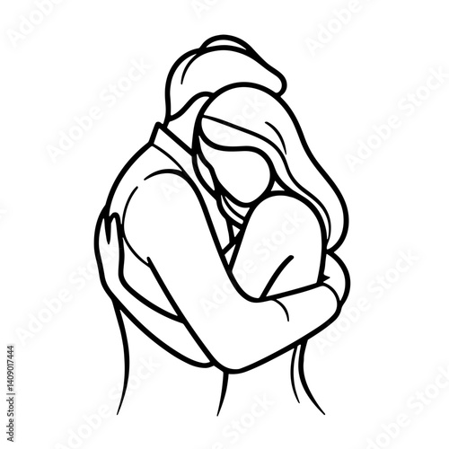 Minimalistic line art illustration of a hugging couple in a clean vector style, emphasizing love