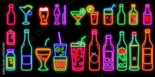 Vibrant neon icons of various alcoholic beverages on a dark background, pub, glowing