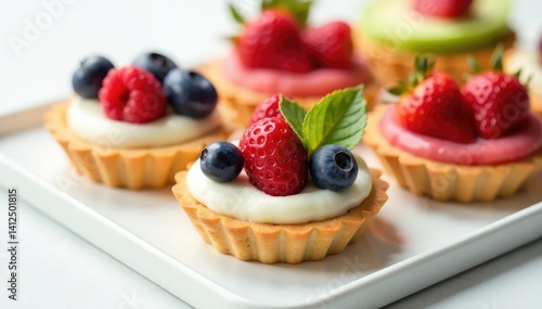 Assorted pastries, fruit tarts on white surface , top view, berry