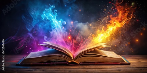 Spellbook pages reveal hidden symbols and incantations as they ignite in a blaze of colorful sparks while dark mist rises from the edges , mystical tome, magical spells