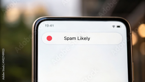Spam call on phone technology, A smartphone screen displays a notification warning that a call is "Spam Likely" with a red indicator, suggesting caution for incoming communications.