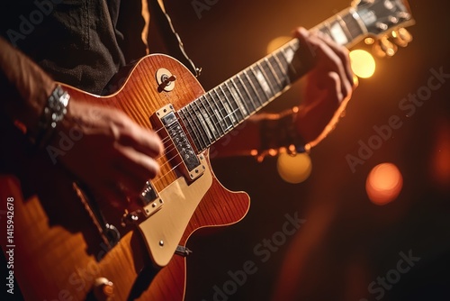 Guitarist on stage on background musician band with soft spotligh. Concept poster for an event