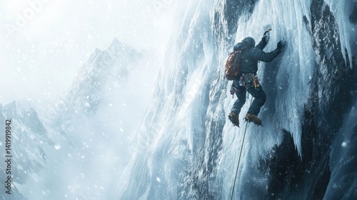 A mountain climber hanging from an overhanging frozen cliff, a blizzard closing in around them.