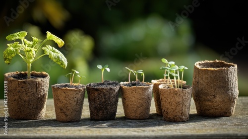 A seedling starter kit with biodegradable pots and soil, arranged on a gardening table