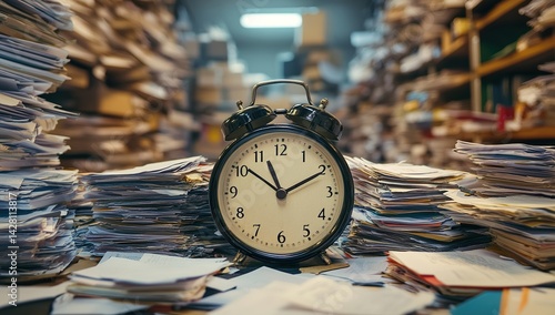 High-resolution image of a clock centered in an office amidst piles and stacks of documents, symbolizing the passage of time beneath, with detailed focus on scattered papers