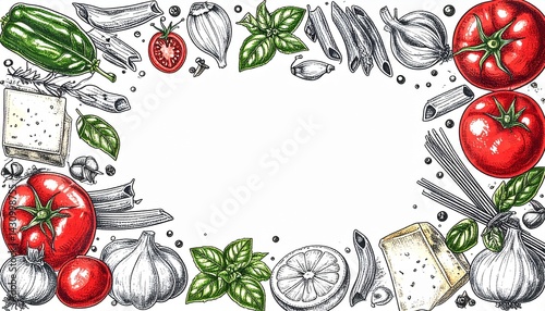 Tło kulinarne z ramką z warzyw i przypraw. Rysunek, szkic