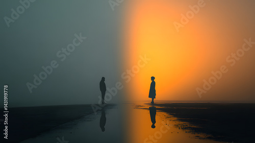 A solitary man and a woman stand facing each other, split between a foggy blue landscape and a warm, glowing sunset.