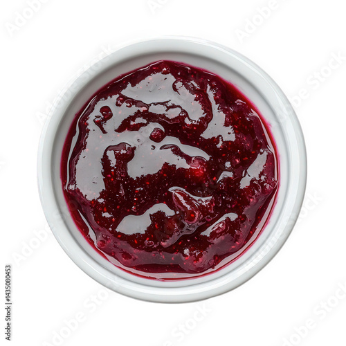 small white bowl filled with a glossy. deep red fruit jam. showcasing a thick. textured consistency that hints at its fruity flavor the jam appears rich and vibrant. perfect for spreading on bread or