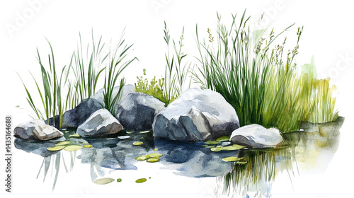 Watercolor painting of a small pond with reeds and stones, isolated on a white background.
