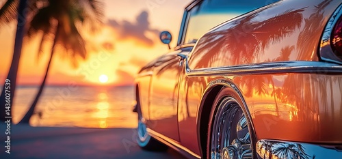 Vintage orange car at sunset near palm trees exotic travel and automotive luxury