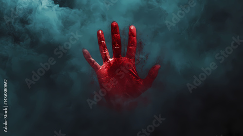 Serial killer, a mysterious red handprint on a fogged surface, captured in high fidelity, evokes intrigue and emotion in this compelling image. Emotion Fog. Illustration