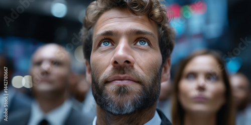 Junger Mann im Anzug schaut überrascht nach oben in einem Bürogebäude