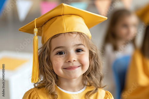 Joyful kindergarten graduation, children wearing vibrant caps, surrounded by indoor decor filled with colorful balloons and cheerful banners.