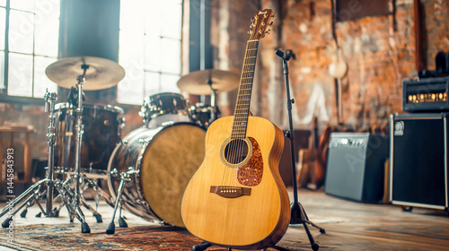 wooden acoustic guitar beside drum set, musical equipment in creative space