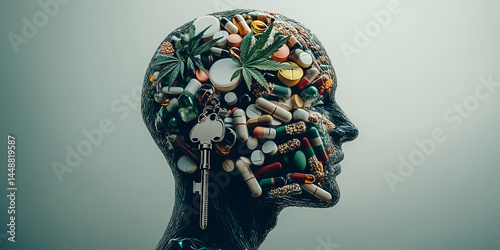Head profile filled with various pills, capsules, and cannabis leaves, symbolizing addiction or substance abuse, mental health issue