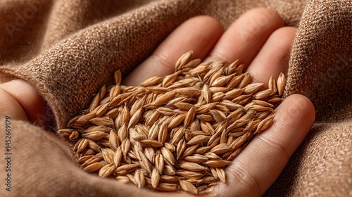 Hand pouring wheat grains harvest Hand holding a handful of seeds on textured fabric background.