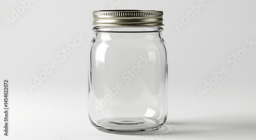 Empty clear glass canning jar, classic mason jar style with metal lid and band. Isolated studio shot on plain white background