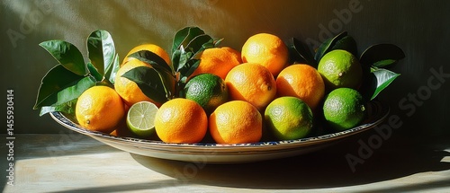 Citrus fruits including oranges and limes are arranged beautifully on ceramic plate, sunlight illuminating vibrant, refreshing colors.