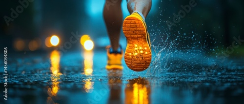 Runner wearing sneakers is shown propelling forward on wet pavement creating water splashes, motion captured highlighting action.