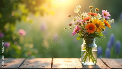 Vibrant flower bouquet of colorful daisies in a glass jar on rustic wooden plank against a sunny garden backdrop
