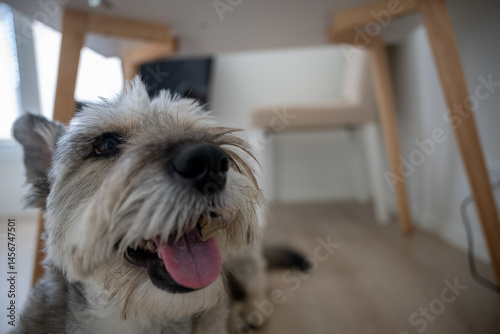Close-up photo of a happy dog with tongue out under modern wooden table, concept of pet joy at home
