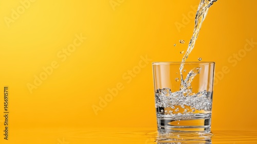 Water gracefully pours into a clear glass against a sunny yellow background, epitomizing freshness, fluidity, and the simple pleasure of a refreshing drink.