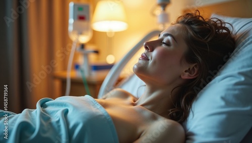 Woman enjoying sanatorium treatment while resting in hospital bed with serene expression