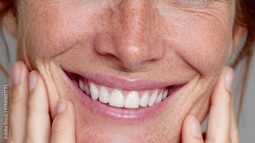 Close-up portrait of a woman, fingers on cheeks, smiling widely with bright white teeth, cropped image to focus on her joyful expression.