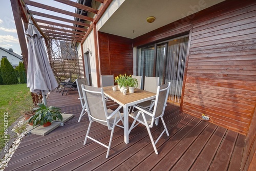 Taras drewniany z białymi meblami ogrodowymi w domu jednorodzinnym – ogród