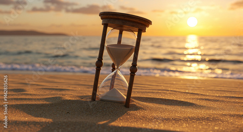Hourglass symbolizing transience of time at sunset on the beach