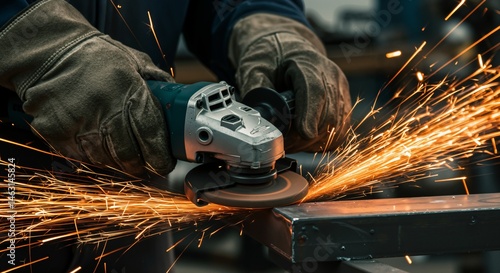 Close-up of a worker's gloved hands operating an angle grinder on a metal beam, sending a shower of bright orange sparks into the air in a workshop setting.