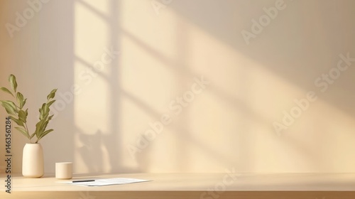 Minimalist workspace still life beige vase green leaves and sunlight shadows