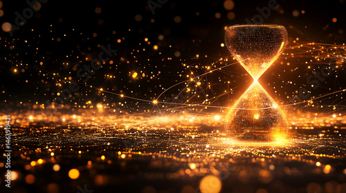 A glowing hourglass made of shimmering particles, set against a dark, ethereal background, suggesting the passage of time and its preciousness.